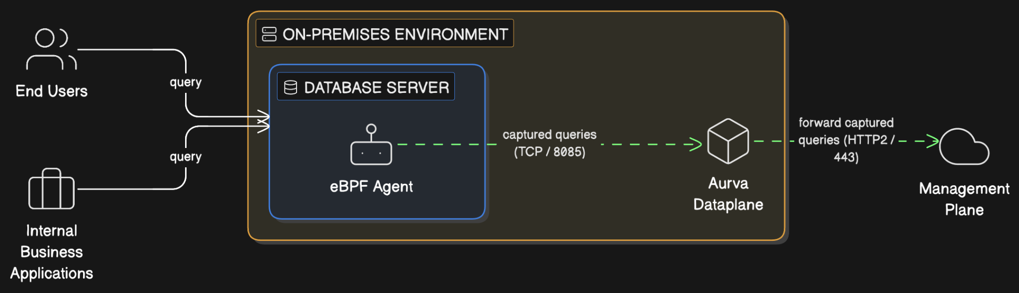 Aurva deploys an eBPF agent directly on the database host. The agent captures queries originating from business applications, end users, or anywhere on the host's network namespace, and relays them to the Aurva Data Plane.