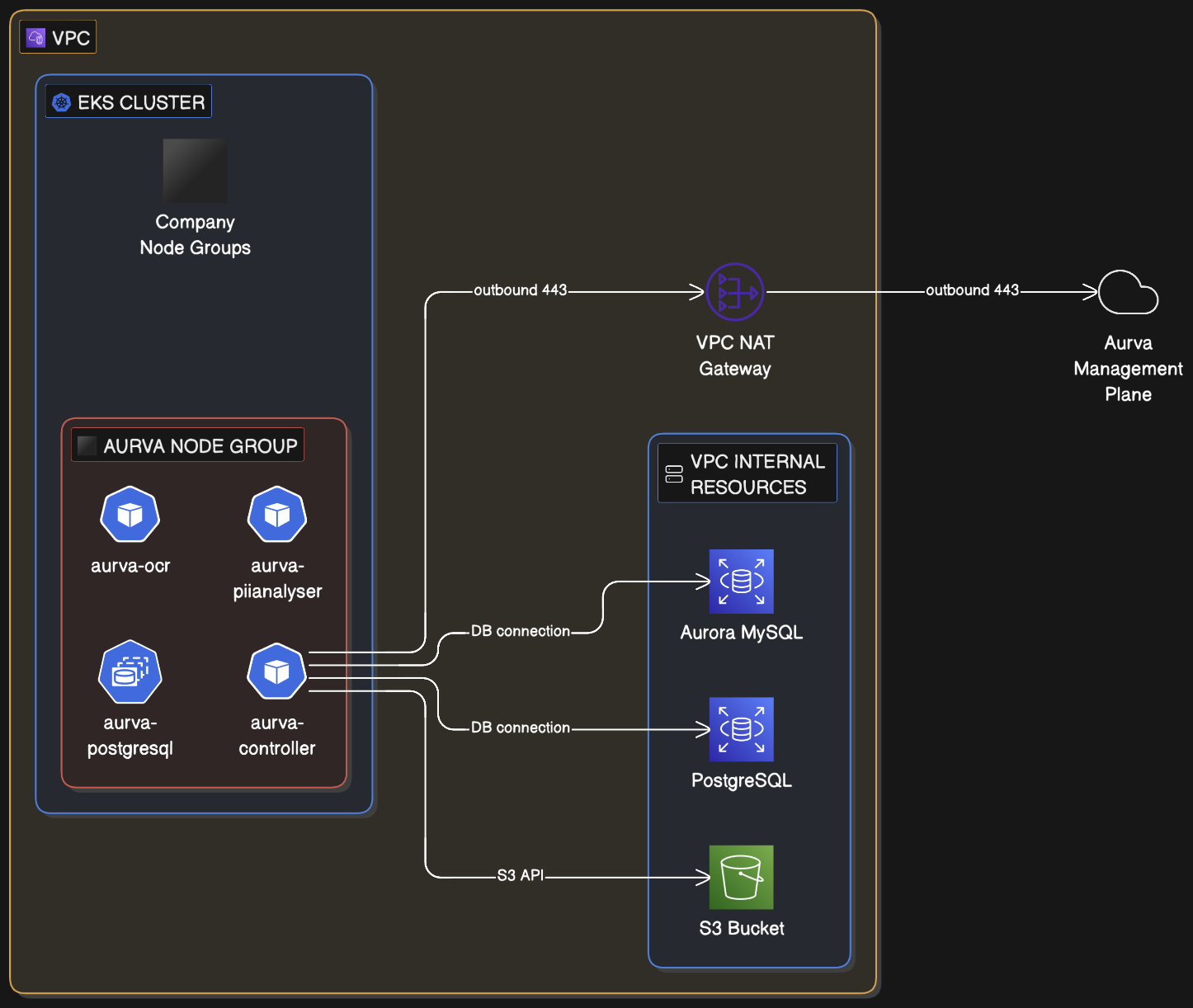 Control Plane URL (command.aurva.io for production, command.uat.aurva.io for PoC) | 443 | Data Plane → Control Plane communication |