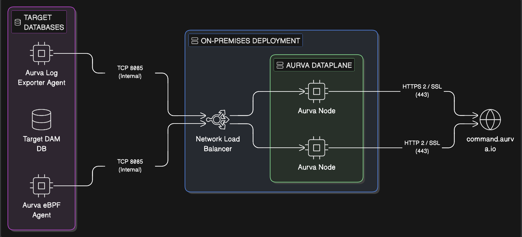 Control Plane URL (command.aurva.io for production, command.uat.aurva.io for PoC; PaaS uses your internal subdomain) | 443 | Data Plane → Control Plane communication |