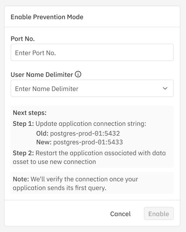 | Enable Prevention mode | Click (+) in Prevention Mode column, enter port and delimiter | Update app connection strings after enabling |