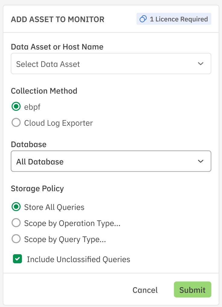 | Storage Policy | Controls which queries are stored for analysis. Three options: Store All Queries (captures everything), Scope by Operation Type (filter by DML, DDL, DCL, etc.), or Scope by Query Type (filter by SELECT, INSERT, UPDATE, etc.). The Include Unclassified Queries checkbox ensures queries that can’t be categorized are also stored. |