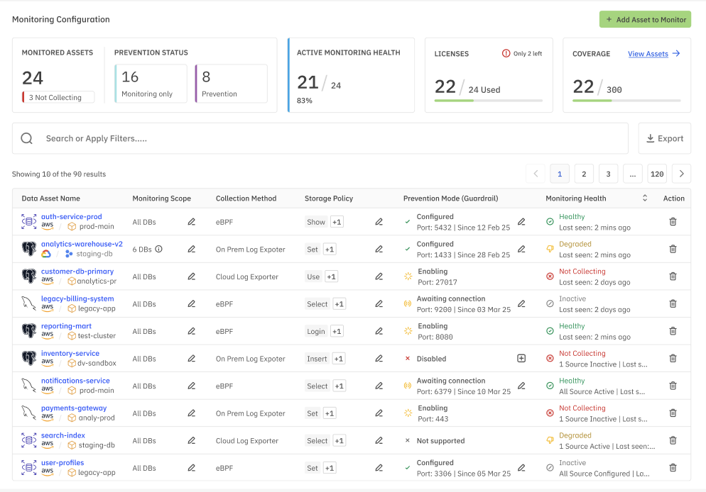 The Monitoring Configuration page is the central control panel for managing Database Activity Monitoring (DAM) across your data assets. From this page, you can view the monitoring status of every asset, add new assets to monitoring, modify storage policies that control which queries are retained, and enable Prevention mode for inline query blocking and data redaction.