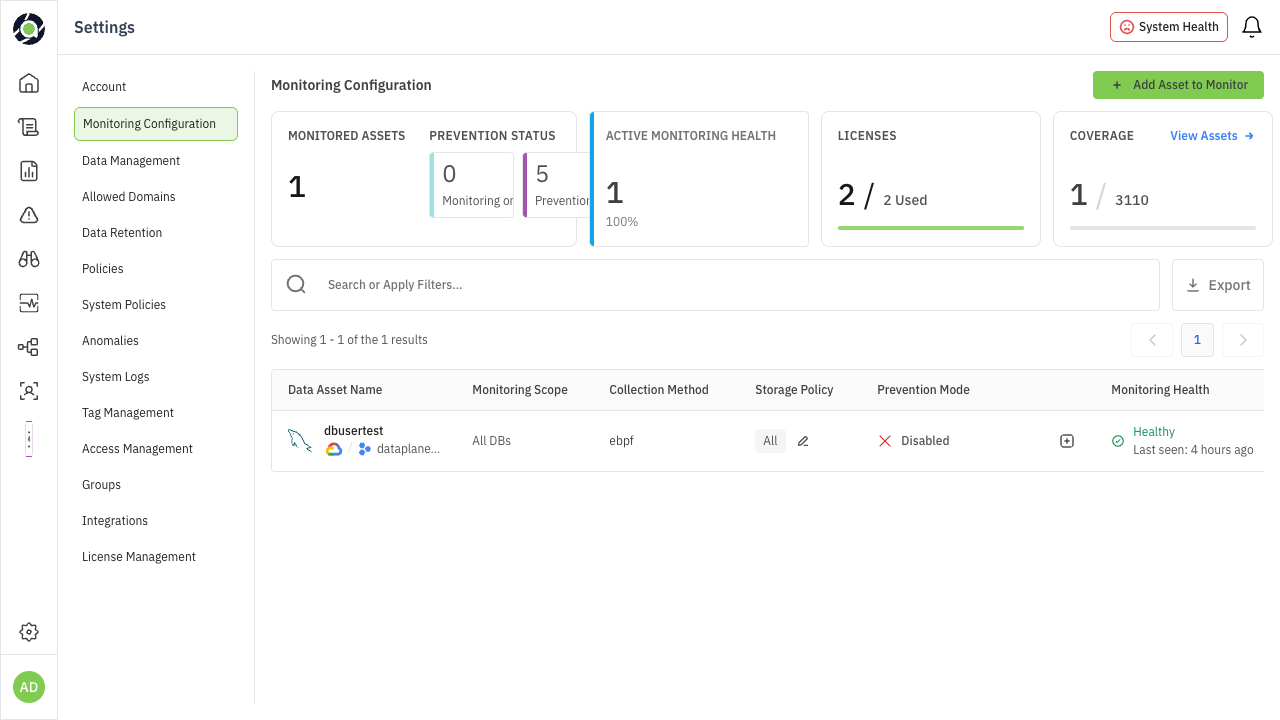 | Coverage | Assets monitored vs. total assets in your environment. | Low coverage means you have unmonitored data assets — potential blind spots in your security posture. |