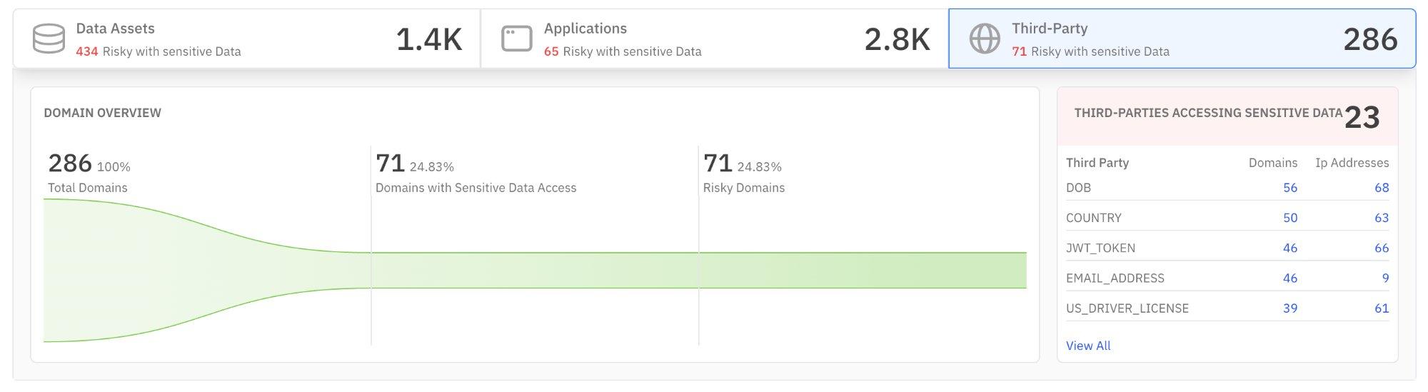 | Third-Parties Accessing Sensitive Data | Ranked list of external domains by the type of sensitive data they access (DOB, country, JWT tokens, email, driver’s license). | Reveals exactly what sensitive data types are leaving your environment and to whom. Critical for GDPR, DPDPA, and cross-border compliance. |