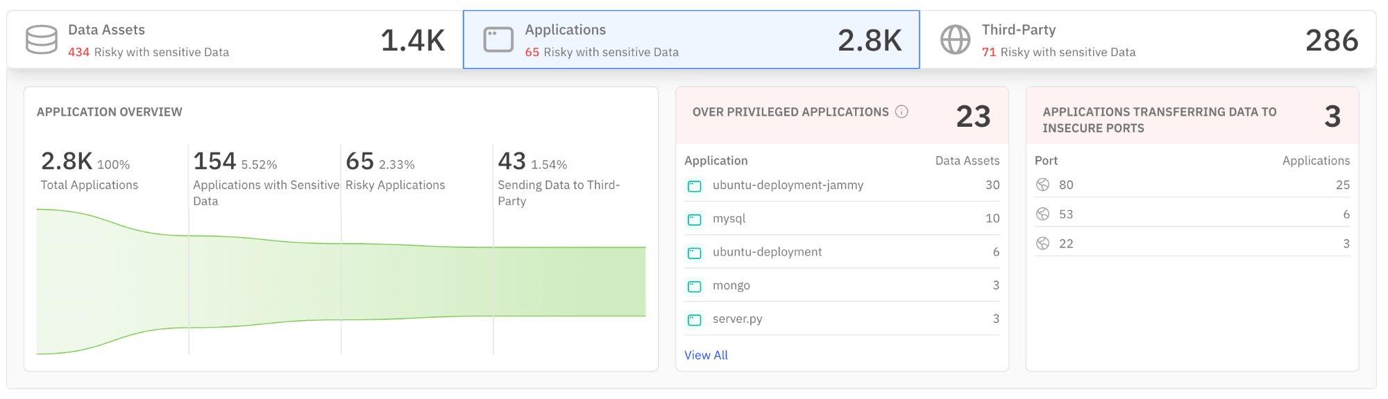 | Application Overview | Total applications, those with sensitive data access, risky applications, and those sending data to third parties. | Reveals shadow access — applications you may not know are touching sensitive data. |
