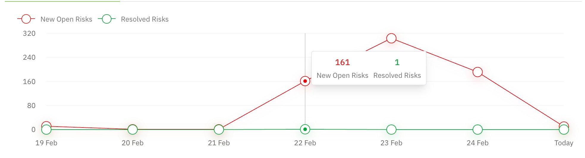 Red line trending up: New risks are being discovered faster than they’re being resolved. Could indicate a new scan uncovering issues, a configuration change, or an active threat.