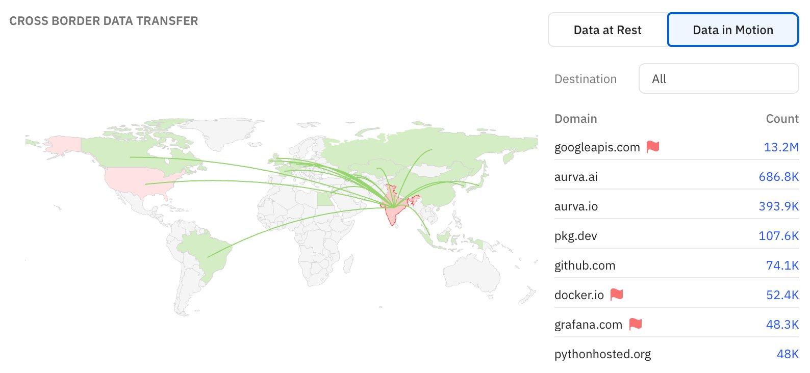 | 🎯 For CISOs & Leadership This is your data residency and cross-border compliance view. If sensitive data is flowing to jurisdictions without adequacy agreements (flagged in red), you may have a regulatory obligation to document or restrict this. Use this section for DPDPA/GDPR reporting and board-level data sovereignty discussions. | 🔧 For Security Operators Focus on flagged domains (red flags). For each, verify: Is this transfer authorized? Is there encryption in transit? Is there a legitimate business need? Work with compliance to document any cross-border flows that require legal basis. |