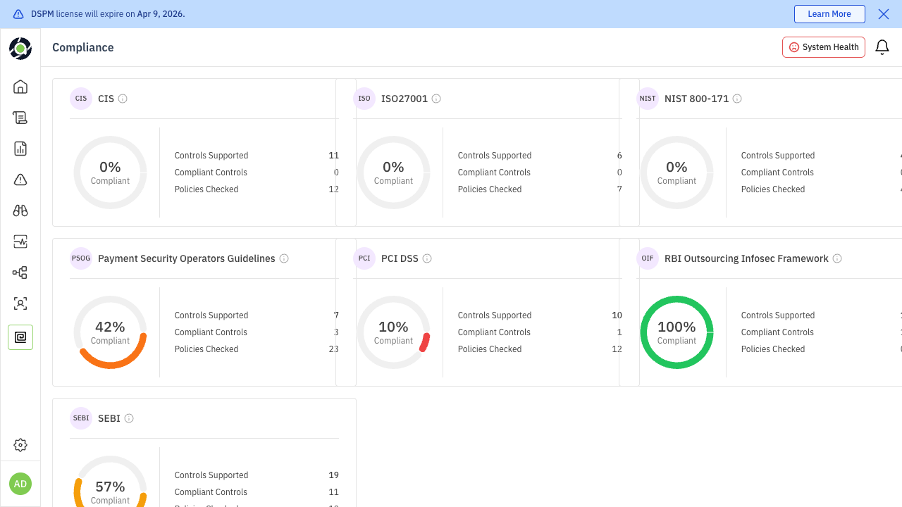 The compliance widget shows your overall compliance percentage and breaks it down by framework. In the example shown, frameworks include NIST, ISO, CIS, PCI, PSOG, SEBI, and OIF, each with their individual compliance score.